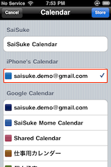Ver. 1.30 has supported the iPhone Calendar App's database access. You can use iPhone Calendar App's Calendars (Google Calendar, MobileMe Calendar etc...) in SaiSuke.