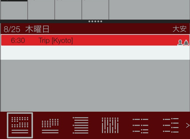 表示モード設定の背景(上2項目)を指定した場合、文字色は色設定の各画面表示の色設定、リスト部予定の色設定に従い、予定の色はアクセント的に時間と文字領域の境界線の色で表示します。