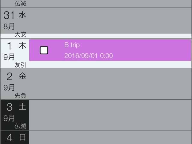表示モード設定の背景(上2項目)を指定した場合、文字色は色設定の各画面表示の色設定、リスト部予定の色設定に従い、予定の色はアクセント的に時間と文字領域の境界線の色で表示します。