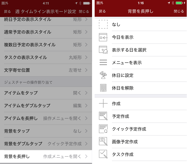背景を長押した際のジェスチャーの割り当てを選択できます。