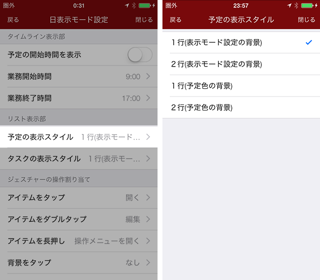 表示モード設定の背景(上2項目)を指定した場合、文字色は色設定の各画面表示の色設定、リスト部予定の色設定に従い、予定の色はアクセント的に時間と文字領域の境界線の色で表示します。