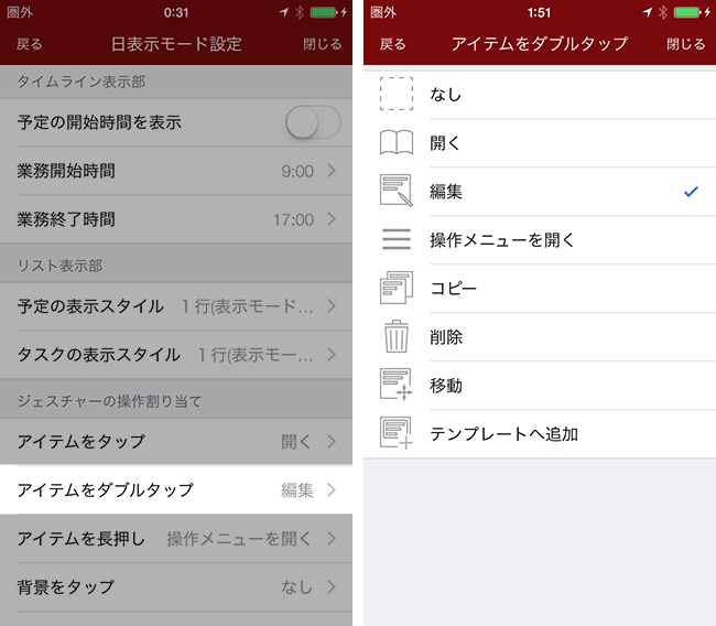 アイテムをダブルタップした際のジェスチャーの割り当てを選択できます。